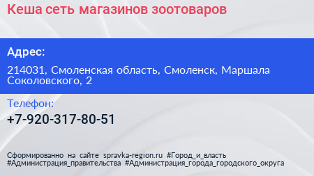 Кеша, сеть магазинов зоотоваров по адресу 214031, Смоленская область, Смоленск, Маршала Соколовского, 2 в дальнейшем Организация, размещена в следующих категориях:
