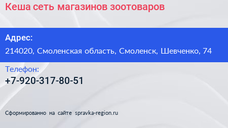 Кеша, сеть магазинов зоотоваров по адресу 214020, Смоленская область, Смоленск, Шевченко, 74 в дальнейшем Организация, размещена в следующих категориях: