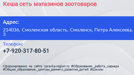 Кеша, сеть магазинов зоотоваров по адресу 214036, Смоленская область, Смоленск, Петра Алексеева, 3 в дальнейшем Организация, размещена в следующих категориях: