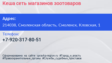 Кеша, сеть магазинов зоотоваров по адресу 214038, Смоленская область, Смоленск, Кловская, 1 в дальнейшем Организация, размещена в следующих категориях: