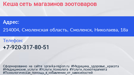 Кеша, сеть магазинов зоотоваров по адресу 214004, Смоленская область, Смоленск, Николаева, 18а в дальнейшем Организация, размещена в следующих категориях:
