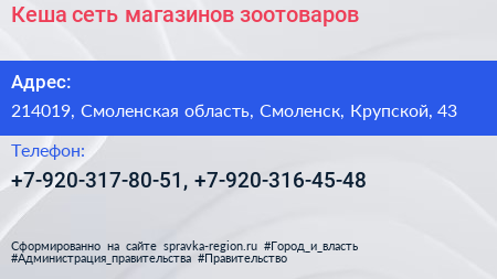Кеша, сеть магазинов зоотоваров по адресу 214019, Смоленская область, Смоленск, Крупской, 43 в дальнейшем Организация, размещена в следующих категориях: