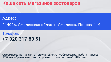 Кеша, сеть магазинов зоотоваров по адресу 214036, Смоленская область, Смоленск, Попова, 119 в дальнейшем Организация, размещена в следующих категориях: