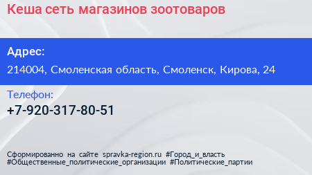 Кеша, сеть магазинов зоотоваров по адресу 214004, Смоленская область, Смоленск, Кирова, 24 в дальнейшем Организация, размещена в следующих категориях: