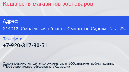 Кеша, сеть магазинов зоотоваров по адресу 214012, Смоленская область, Смоленск, Садовая 2-я, 25а в дальнейшем Организация, размещена в следующих категориях: