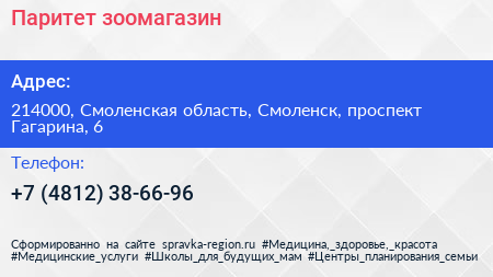 Паритет, зоомагазин по адресу 214000, Смоленская область, Смоленск, проспект Гагарина, 6 в дальнейшем Организация, размещена в следующих категориях: