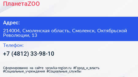 ПланетаZOO по адресу 214004, Смоленская область, Смоленск, Октябрьской Революции, 13 в дальнейшем Организация, размещена в следующих категориях: