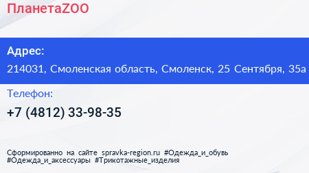 ПланетаZOO по адресу 214031, Смоленская область, Смоленск, 25 Сентября, 35а в дальнейшем Организация, размещена в следующих категориях: