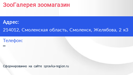 ЗооГалерея, зоомагазин по адресу 214012, Смоленская область, Смоленск, Желябова, 2 к3 в дальнейшем Организация, размещена в следующих категориях: