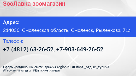 ЗооЛавка, зоомагазин по адресу 214036, Смоленская область, Смоленск, Рыленкова, 71а в дальнейшем Организация, размещена в следующих категориях: