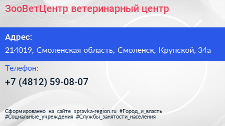 ЗооВетЦентр, ветеринарный центр по адресу 214019, Смоленская область, Смоленск, Крупской, 34а в дальнейшем Организация, размещена в следующих категориях: