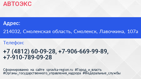 АВТОЭКС по адресу 214032, Смоленская область, Смоленск, Лавочкина, 107а в дальнейшем Организация, размещена в следующих категориях: