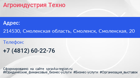 Агроиндустрия-Техно по адресу 214530, Смоленская область, Смоленск, Смоленская, 20 в дальнейшем Организация, размещена в следующих категориях:
