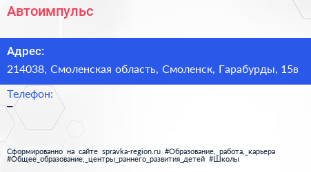 Автоимпульс по адресу 214038, Смоленская область, Смоленск, Гарабурды, 15в в дальнейшем Организация, размещена в следующих категориях: