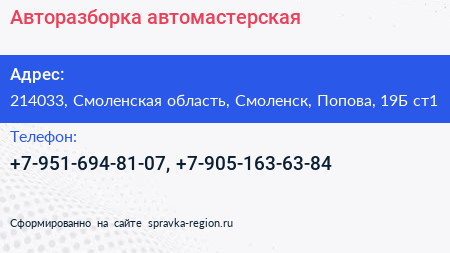 Авторазборка, автомастерская по адресу 214033, Смоленская область, Смоленск, Попова, 19Б ст1 в дальнейшем Организация, размещена в следующих категориях: