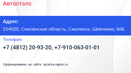 Автостэлс по адресу 214020, Смоленская область, Смоленск, Шевченко, 86Б в дальнейшем Организация, размещена в следующих категориях: