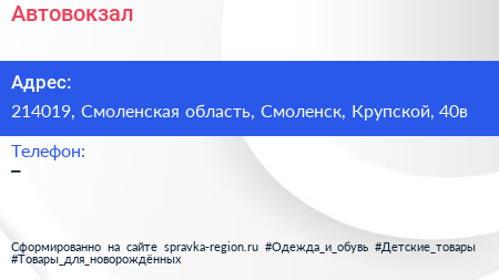 Автовокзал по адресу 214019, Смоленская область, Смоленск, Крупской, 40в в дальнейшем Организация, размещена в следующих категориях: