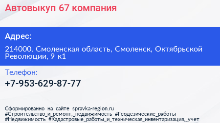 Автовыкуп 67, компания по адресу 214000, Смоленская область, Смоленск, Октябрьской Революции, 9 к1 в дальнейшем Организация, размещена в следующих категориях: