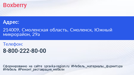 Boxberry по адресу 214009, Смоленская область, Смоленск, Южный микрорайон, 29а в дальнейшем Организация, размещена в следующих категориях: