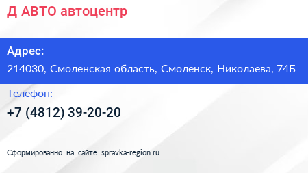 Д-АВТО, автоцентр по адресу 214030, Смоленская область, Смоленск, Николаева, 74Б в дальнейшем Организация, размещена в следующих категориях: