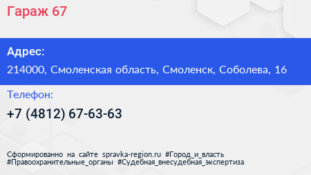 Гараж 67 по адресу 214000, Смоленская область, Смоленск, Соболева, 16 в дальнейшем Организация, размещена в следующих категориях: