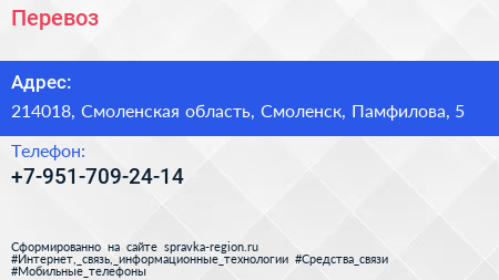 Перевоз по адресу 214018, Смоленская область, Смоленск, Памфилова, 5 в дальнейшем Организация, размещена в следующих категориях: