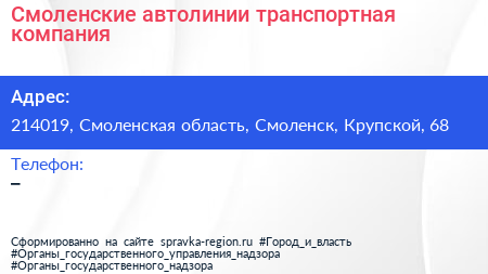 Смоленские автолинии, транспортная компания по адресу 214019, Смоленская область, Смоленск, Крупской, 68 в дальнейшем Организация, размещена в следующих категориях: