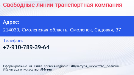 Свободные линии, транспортная компания по адресу 214033, Смоленская область, Смоленск, Садовая, 37 в дальнейшем Организация, размещена в следующих категориях: