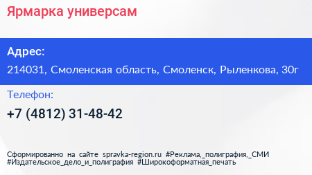 Ярмарка, универсам по адресу 214031, Смоленская область, Смоленск, Рыленкова, 30г в дальнейшем Организация, размещена в следующих категориях: