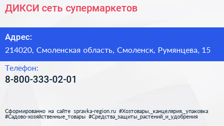 ДИКСИ, сеть супермаркетов по адресу 214020, Смоленская область, Смоленск, Румянцева, 15 в дальнейшем Организация, размещена в следующих категориях: