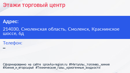 Этажи, торговый центр по адресу 214030, Смоленская область, Смоленск, Краснинское шоссе, 6д в дальнейшем Организация, размещена в следующих категориях: