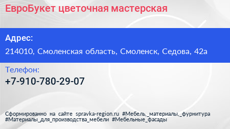 ЕвроБукет, цветочная мастерская по адресу 214010, Смоленская область, Смоленск, Седова, 42а в дальнейшем Организация, размещена в следующих категориях: