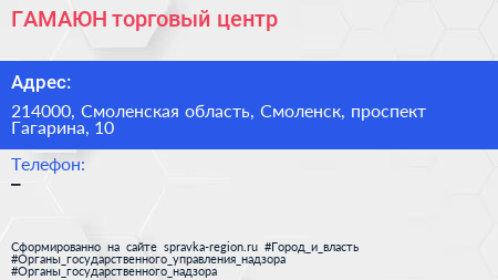 ГАМАЮН, торговый центр по адресу 214000, Смоленская область, Смоленск, проспект Гагарина, 10 в дальнейшем Организация, размещена в следующих категориях: