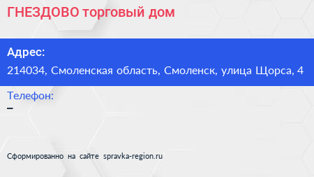 ГНЕЗДОВО, торговый дом по адресу 214034, Смоленская область, Смоленск, улица Щорса, 4 в дальнейшем Организация, размещена в следующих категориях: