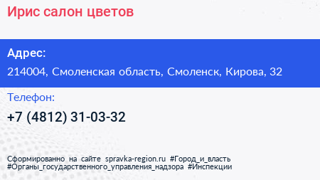 Ирис, салон цветов по адресу 214004, Смоленская область, Смоленск, Кирова, 32 в дальнейшем Организация, размещена в следующих категориях: