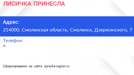 ЛИСИЧКА ПРИНЕСЛА по адресу 214000, Смоленская область, Смоленск, Дзержинского, 7 в дальнейшем Организация, размещена в следующих категориях: