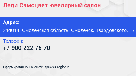 Леди Самоцвет, ювелирный салон по адресу 214014, Смоленская область, Смоленск, Твардовского, 17 в дальнейшем Организация, размещена в следующих категориях: