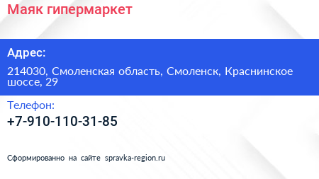 Маяк, гипермаркет по адресу 214030, Смоленская область, Смоленск, Краснинское шоссе, 29 в дальнейшем Организация, размещена в следующих категориях: