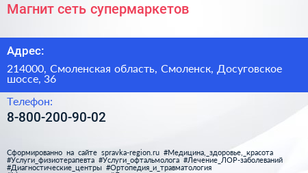 Магнит, сеть супермаркетов по адресу 214000, Смоленская область, Смоленск, Досуговское шоссе, 36 в дальнейшем Организация, размещена в следующих категориях: