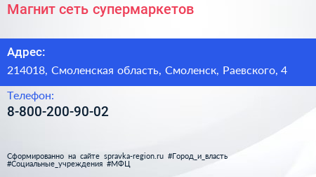 Магнит, сеть супермаркетов по адресу 214018, Смоленская область, Смоленск, Раевского, 4 в дальнейшем Организация, размещена в следующих категориях: