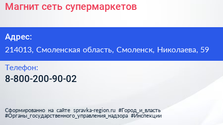 Магнит, сеть супермаркетов по адресу 214013, Смоленская область, Смоленск, Николаева, 59 в дальнейшем Организация, размещена в следующих категориях: