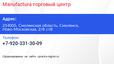 Manufactura, торговый центр по адресу 214005, Смоленская область, Смоленск, Ново-Московская, 2/8 ст8 в дальнейшем Организация, размещена в следующих категориях: