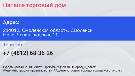 Наташа, торговый дом по адресу 214012, Смоленская область, Смоленск, Ново-Ленинградская, 11 в дальнейшем Организация, размещена в следующих категориях: