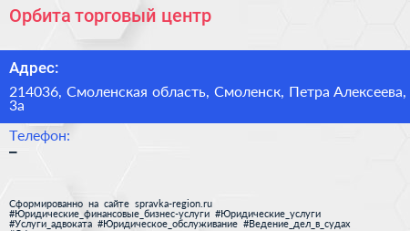 Орбита, торговый центр по адресу 214036, Смоленская область, Смоленск, Петра Алексеева, 3а в дальнейшем Организация, размещена в следующих категориях: