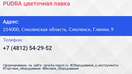 PUDRA, цветочная лавка по адресу 214000, Смоленская область, Смоленск, Глинки, 9 в дальнейшем Организация, размещена в следующих категориях: