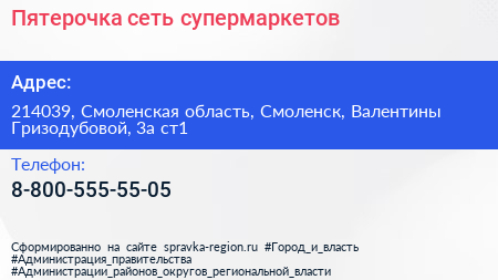 Пятерочка, сеть супермаркетов по адресу 214039, Смоленская область, Смоленск, Валентины Гризодубовой, 3а ст1 в дальнейшем Организация, размещена в следующих категориях: