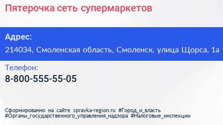 Пятерочка, сеть супермаркетов по адресу 214034, Смоленская область, Смоленск, улица Щорса, 1а в дальнейшем Организация, размещена в следующих категориях: