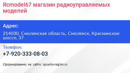 Rcmodel67, магазин радиоуправляемых моделей по адресу 214030, Смоленская область, Смоленск, Краснинское шоссе, 37 в дальнейшем Организация, размещена в следующих категориях: