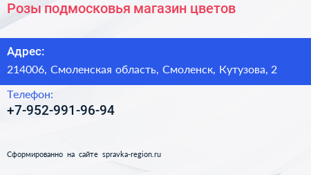 Розы подмосковья, магазин цветов по адресу 214006, Смоленская область, Смоленск, Кутузова, 2 в дальнейшем Организация, размещена в следующих категориях: