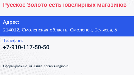 Русское Золото, сеть ювелирных магазинов по адресу 214012, Смоленская область, Смоленск, Беляева, 6 в дальнейшем Организация, размещена в следующих категориях: